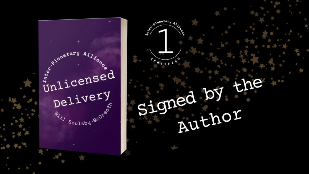 A signed and lovingly packaged paperback copy of Unlicensed Delivery direct from my hands to yours.